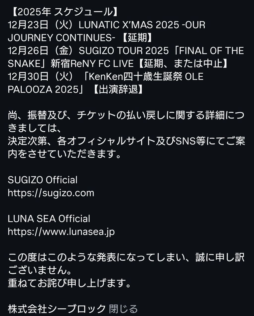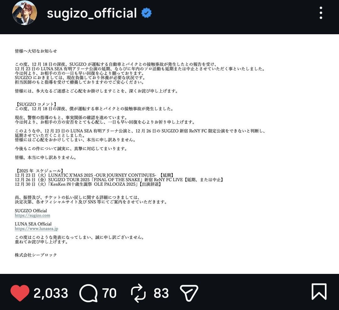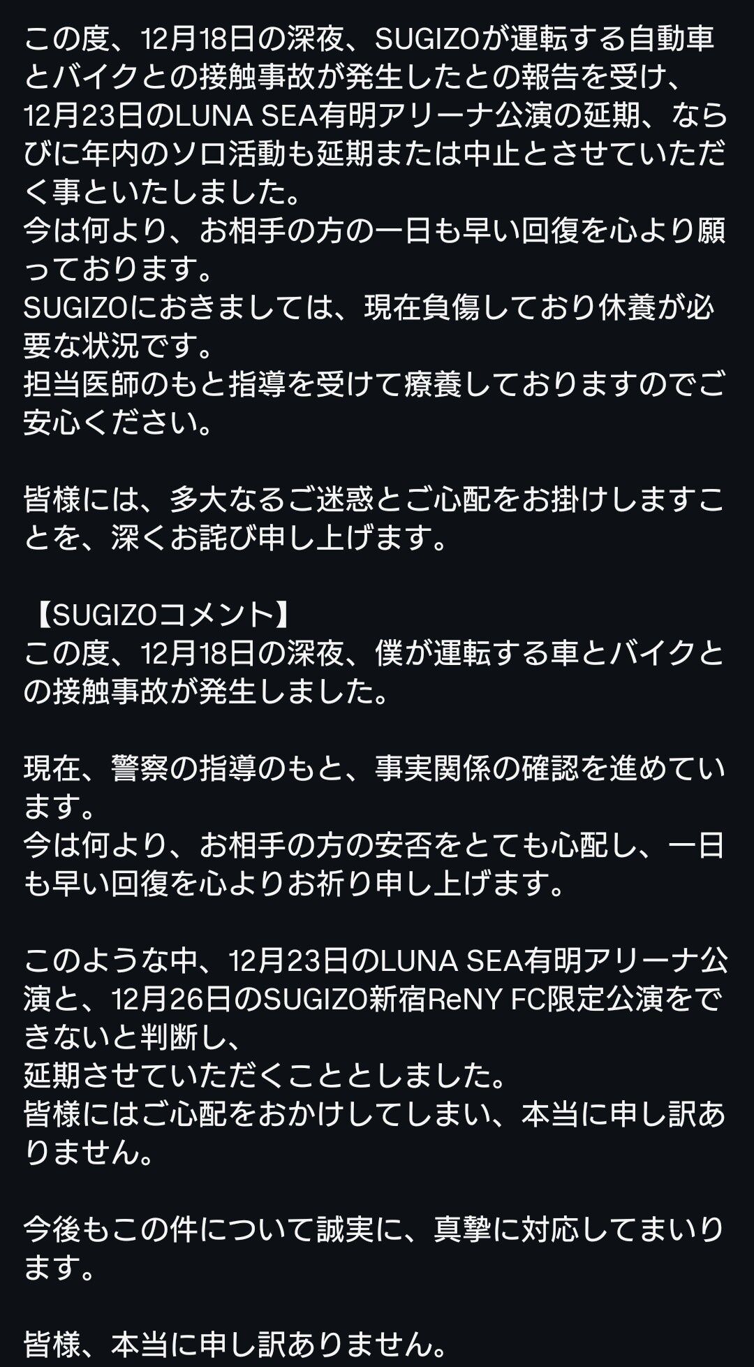 XJAPAN&LUNASEAのSUGIZOさん(56)が自動車事故…有明アリーナも新宿ReNYも年内LIVEも全部中止…