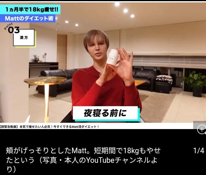 1月19日までに、タレントのMattが自身のYouTubeを更新し、マイナス18kgのダイエットに成功したという近影を披露した。