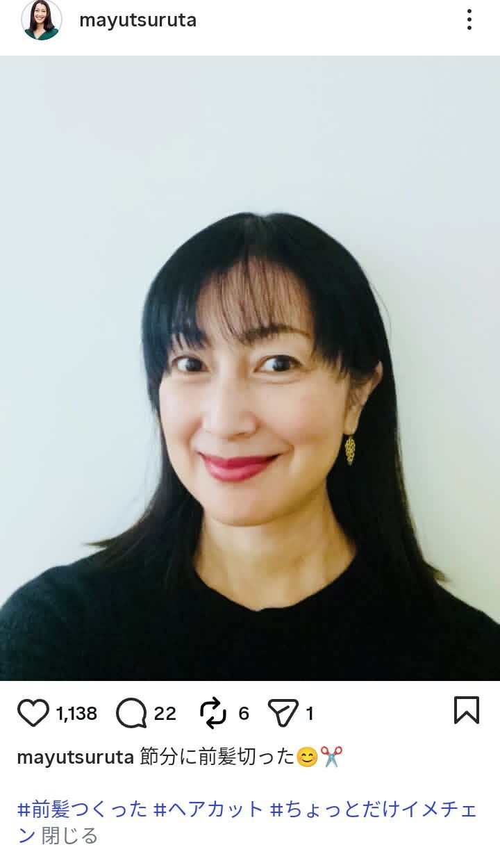 その鶴田は「節分に前髪切った」とつづり、自身の写真をアップ。鶴田はおでこを出したスタイルの印象が強いが、髪を切り、「前髪つくった」ことを報告している。