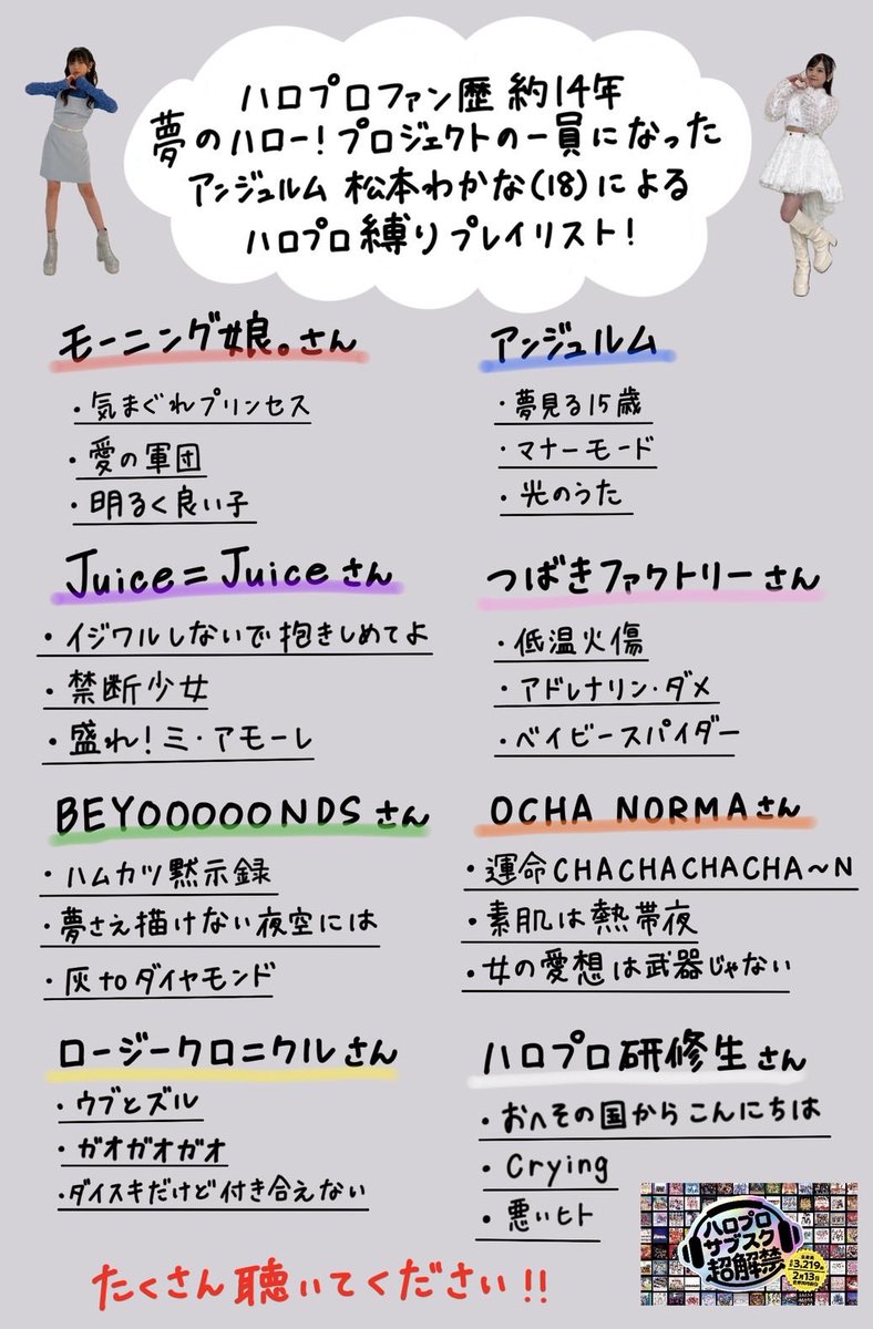 夢のハロー!プロジェクトの一員になったアンジュルム松本わかな(18)による、ハロプロ縛り&スマイレージ/アンジュルム プレイリストを書き出してみました!