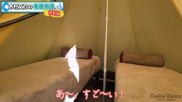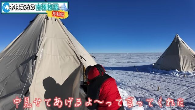 ランチのあとは飛行機で3時間ほどかけ、南極点の近くまで向かう。南極点に近い場所に着陸し、『ディクシーズキャンプ』という場所で1泊。テントが並んでいる様子を見た彼女は「サバイバル感も出てて、私嫌いじゃないわ」と、旅好きの一面を見せた。宿泊用テントといっても市販されているようなもので、狭いスペースにベッドが2つ並んでいるだけの非常にシンプルな作り。生地も至って普通のもので、「本当寝るだけのテント」とコメント。