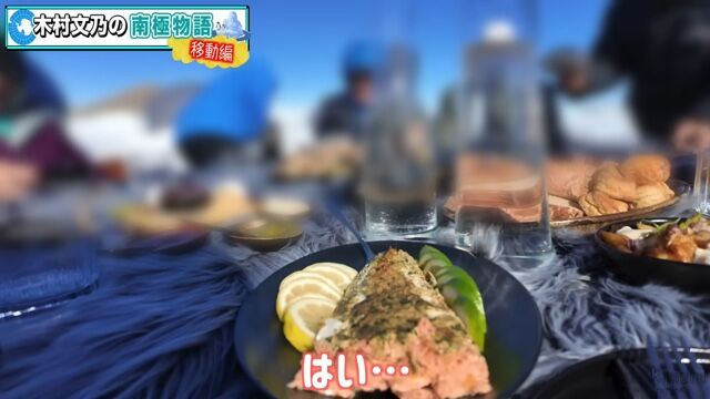 途中、テントが設置されている場所で車から降ろされた一行は、ランチを食べることに。ランチはなんとアウトドアスタイルで、外で済ませるようだ。だが、あまりの寒さでテーブルの上にある水が凍ってしまうような状況。ポテトの料理やブラウニーなどが振る舞われたが、木村は極寒に耐えきれずテントに退避。「暖かいところで美味しいね!って穏やかに食べるご飯のほうがいいかもしれない(笑)」「南極初ランチは『寒い』の感想で終わりました」と、早くも南極の洗礼を受けている様子だ。