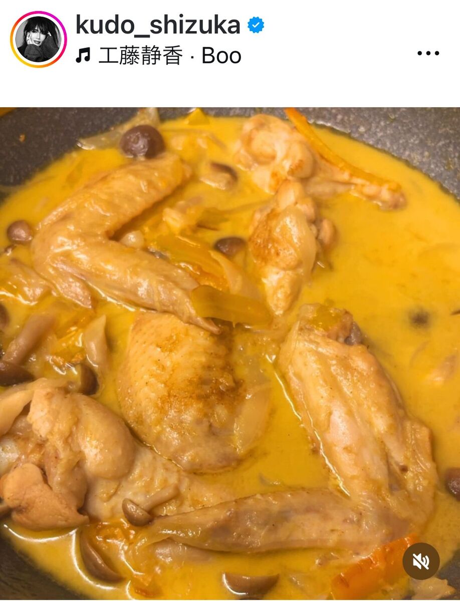 「チキンの骨も皮もしっかり煮込む!トロミも出て美味(おい)しいです!普通にカレー」と記し、手羽先を使用した具材たっぷりのカレーの写真や料理工程の動画などをアップ。「鶏肉を先に炒(いた)めて、野菜やきのこ。しんなりしたら水、アクや油を取り除き、そしてココナッツミルクを入れて出汁(だし)を投入、そしてカレー粉」とレシピを紹介した。