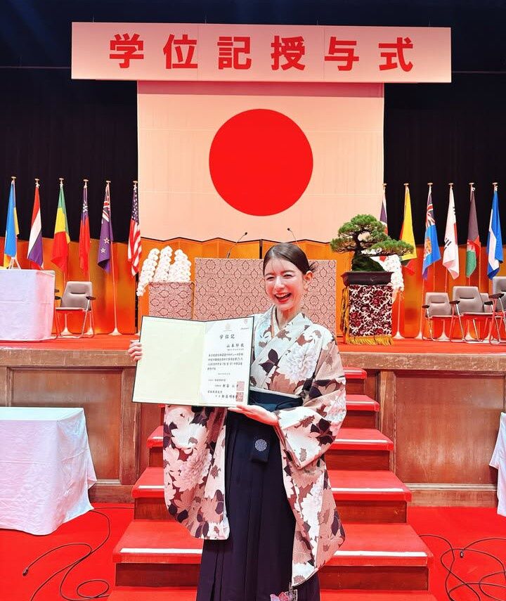「日本経済大学を卒業しました」と学校名も明かし、日本経済大学の福岡キャンパスを位置情報にタグ付け。学位記授与式の思い出ショットをアップした。
