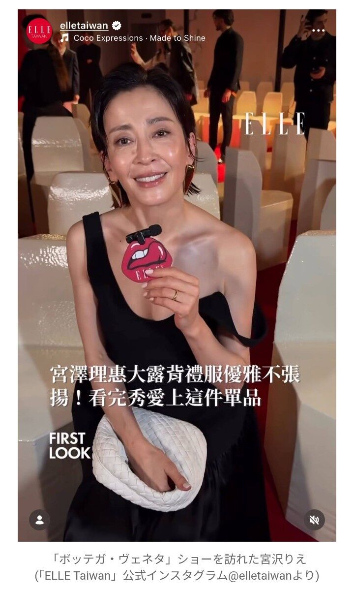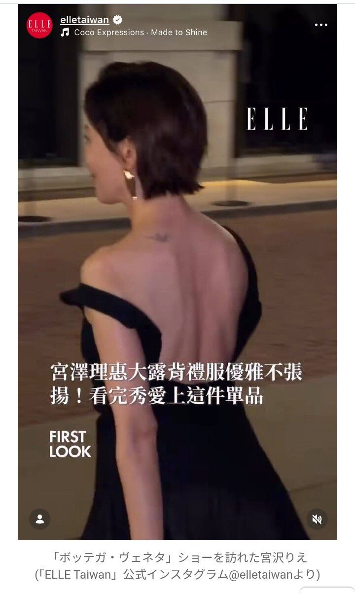 イタリア・ミラノで開催された「ボッテガ・ヴェネタ」2026-27秋冬コレクションショーを訪れた宮沢は、胸元と背中が大きくあき、片方の肩ひもを落としたスタイルの漆黒ドレス姿で会場に向かう様子をファッション誌「ELLE」台湾公式インスタグラムが紹介。背中にはタトゥーがはっきりと見えていた。