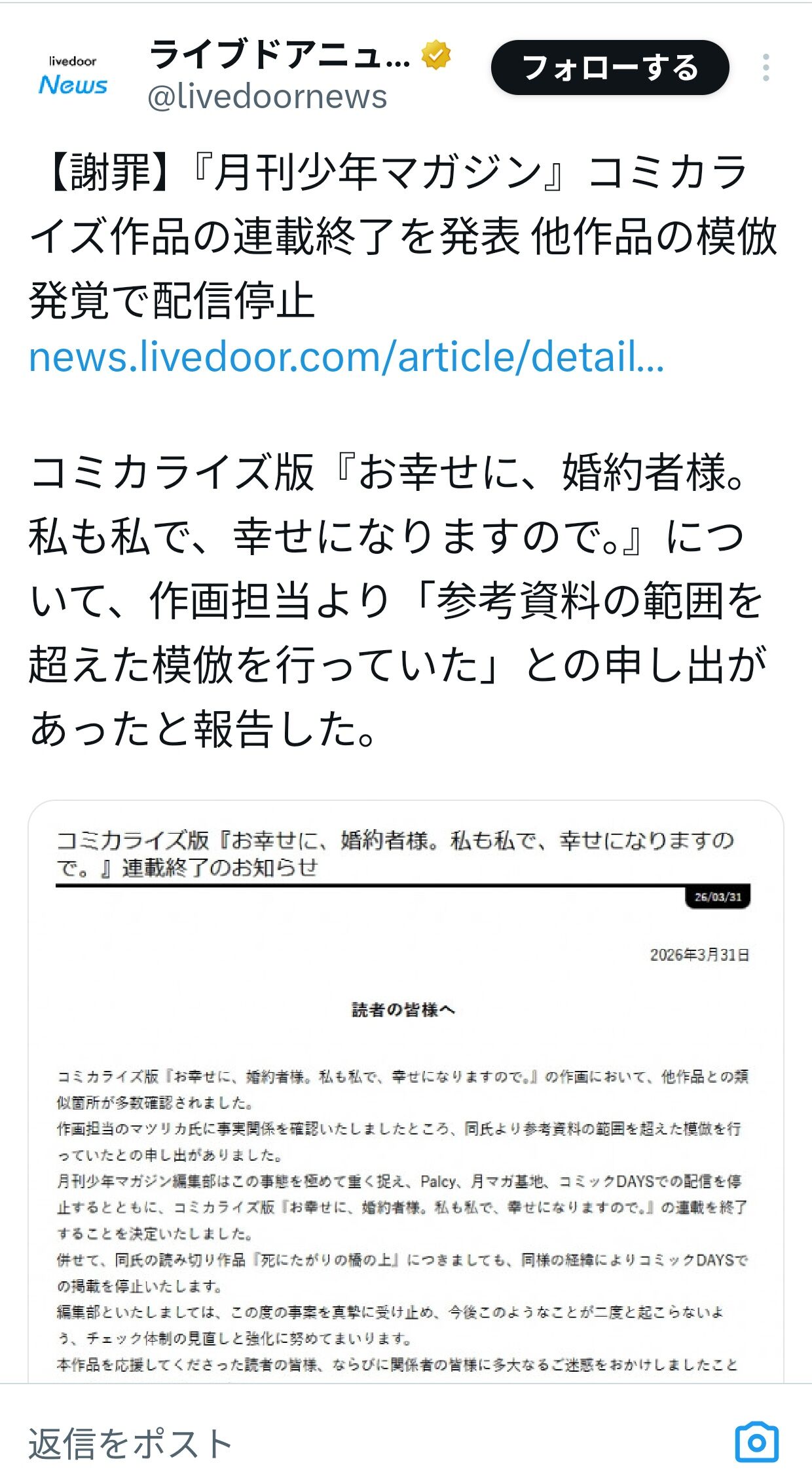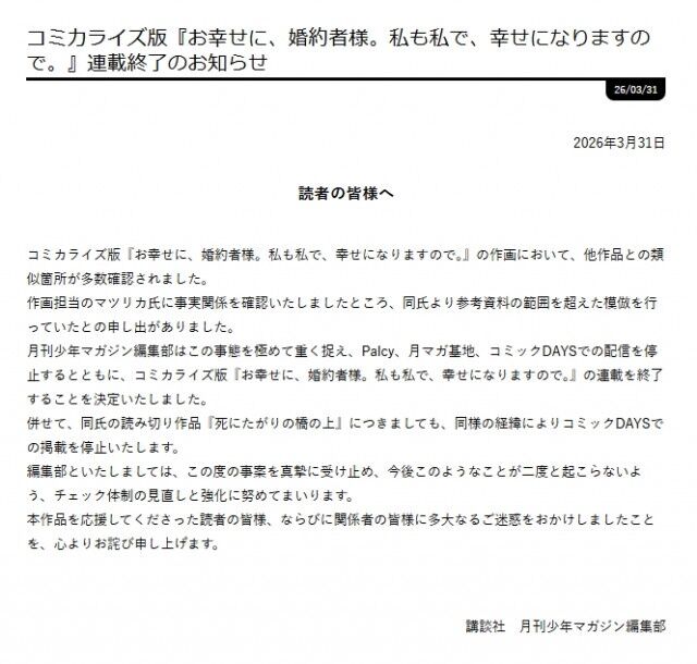 月刊少年マガジンの人気漫画、作画担当のパクリ問題で連載打ち切りに