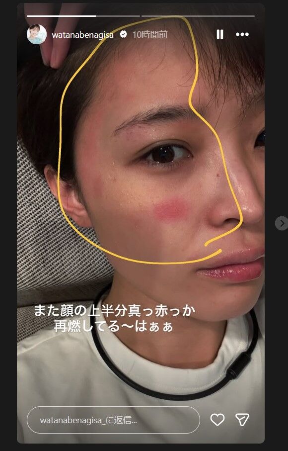 今回、ストーリーズを更新し、「また顔の上半分真っ赤っか 再燃してる~はぁぁ」とつづり、右頬とこめかみ部分が赤くなっている写真を公開。険しい表情を浮かべていた。