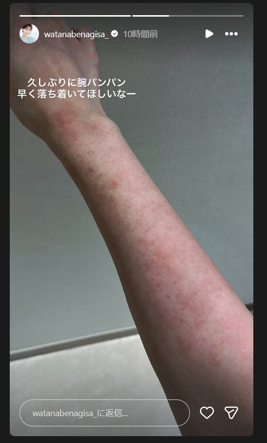 2枚目はじんましんが出たとみられる腕の写真を公開し「久しぶりに腕パンパン 早く落ち着いてほしいなー」とつづった。