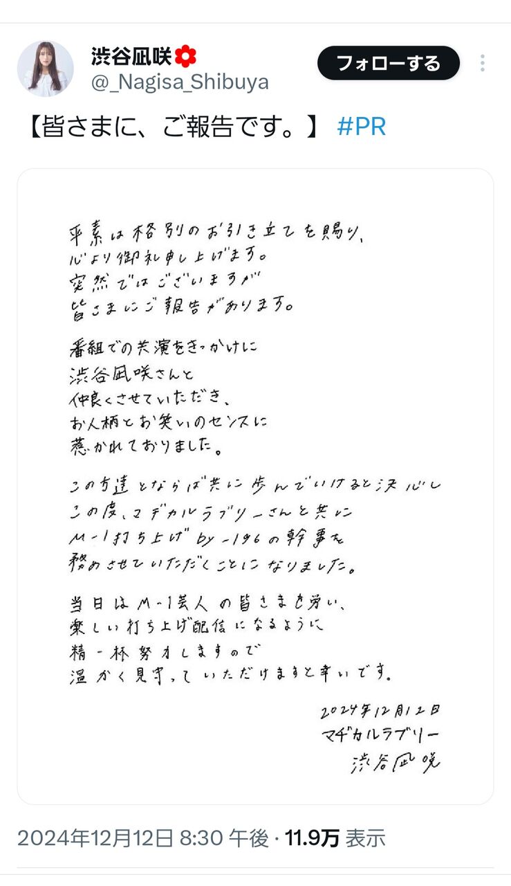 | マヂラブ、元アイドルと連名で“ご報告” 直筆文にネット騒然「びっくり」「3度見した」 …をきっかけに 渋谷凪咲さんと 仲良くさせていただき、お人柄とお笑いのセンスに 惹かれておりました」と、元NMB48でタレントの渋谷凪咲についてコメントした。 (出典:) |